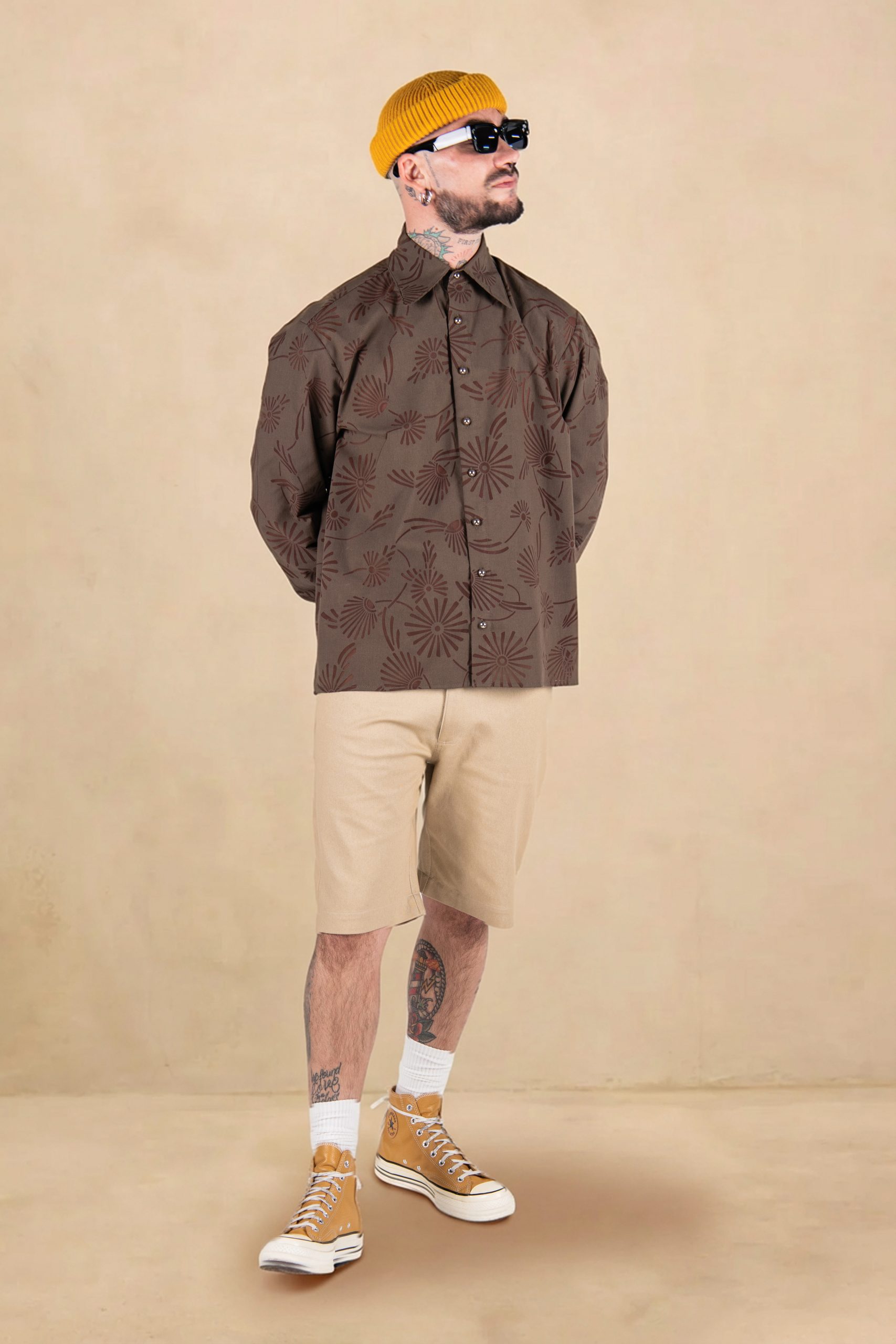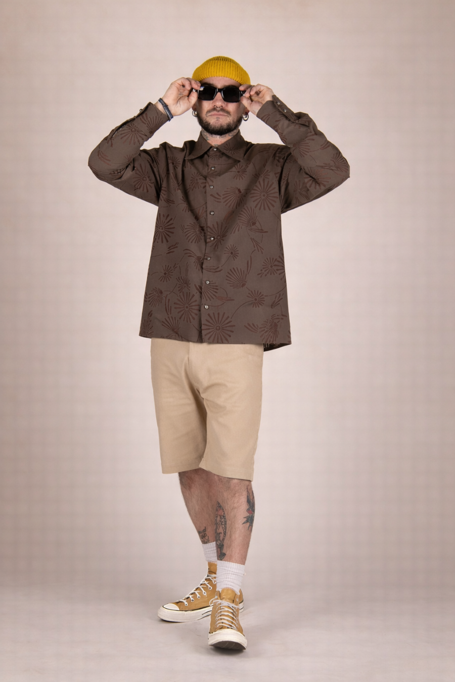 Made from high-quality 100% polyester, this shirt offers a smooth, structured feel enhanced by a semi-transparent print that adds depth and subtle visual layering. The rounded metal buttons introduce a refined modern touch, balancing the bold pattern with a clean, contemporary aesthetic. A distinctive statement piece that combines comfort, character, and elevated streetwear style.